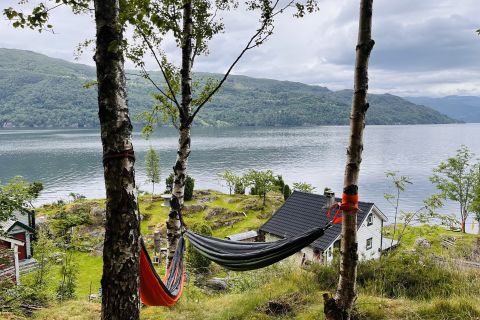 Vi har åpnet en hengekøyepark like over tunet i Vannes, med storslått utsikt og flott beliggenhet. Det er plass til ca 10 hengekøyer